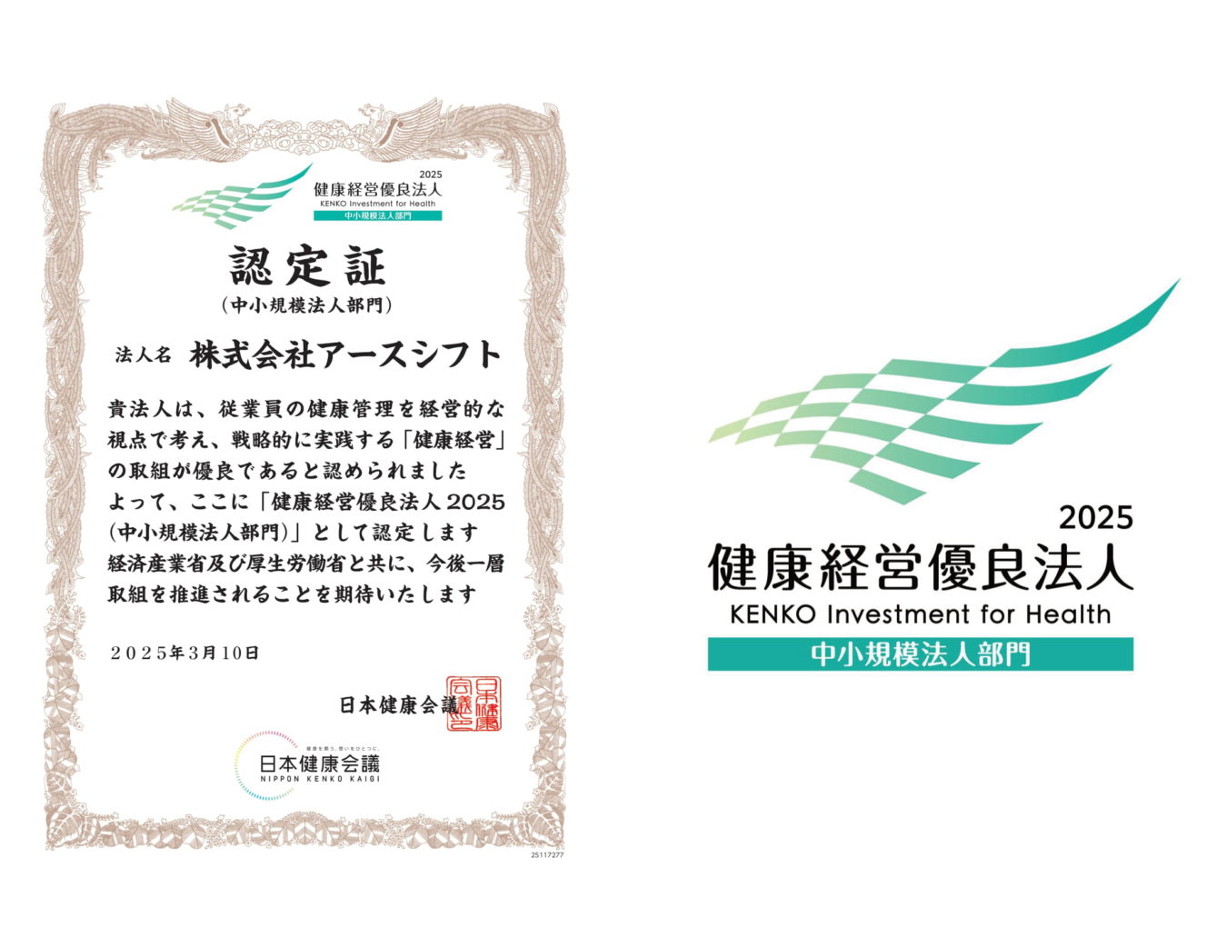 株式会社アースシフトは、経済産業省と日本健康会議が共同で選定を行う「健康経営優良法人2025(中小規模法人部門)」に、2022年度から4年連続で認定されました。