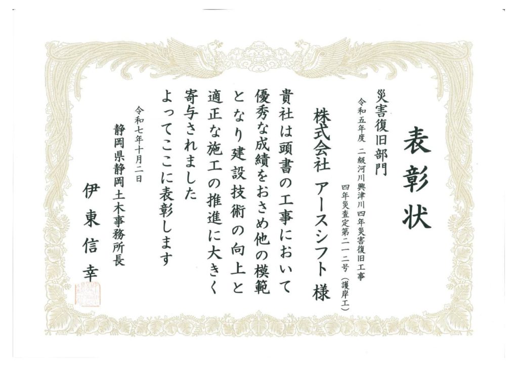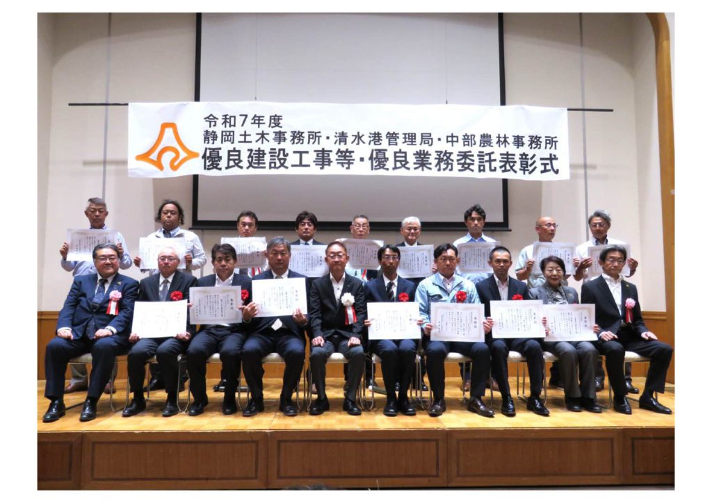 静岡県静岡土木事務所より、令和7年度 災害復旧部門、ICT優良工事部門で表彰いただきました。