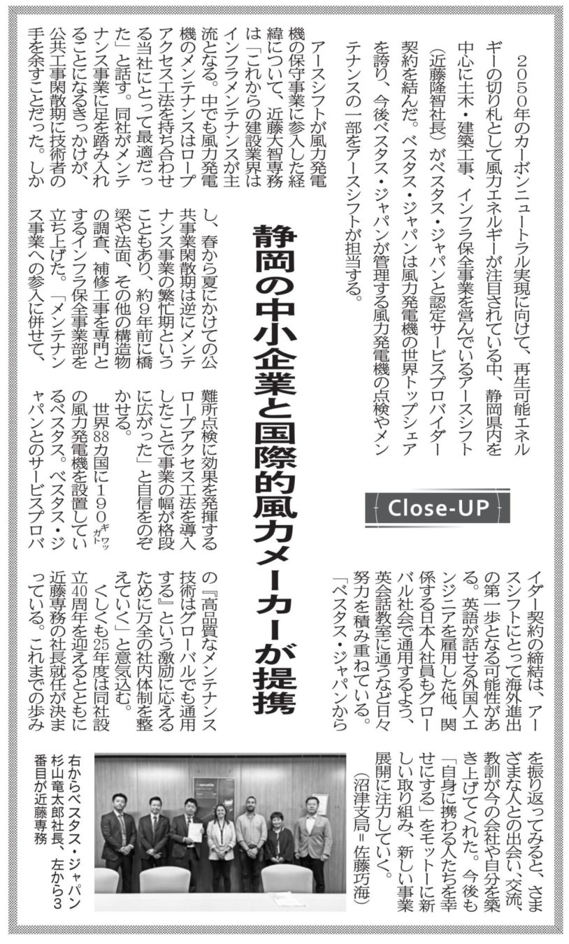 6.2建通新聞に全国掲載されました ~静岡の中小企業と国際的風力メーカーが提携~