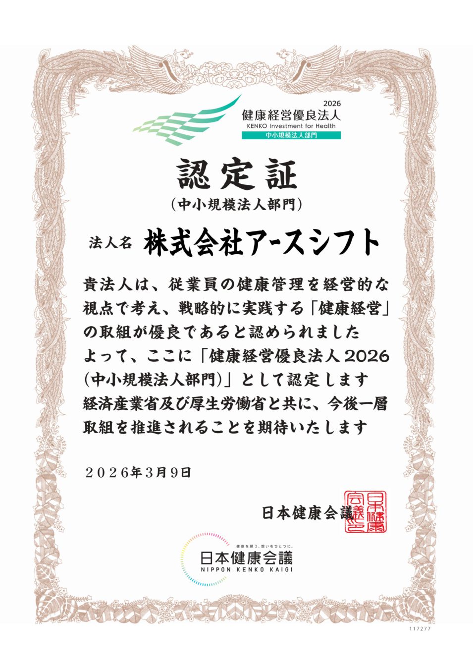 株式会社アースシフトは、経済産業省と日本健康会議が共同で選定を行う「健康経営優良法人2026(中小規模法人部門)」に、2022年度から5年連続で認定されました。