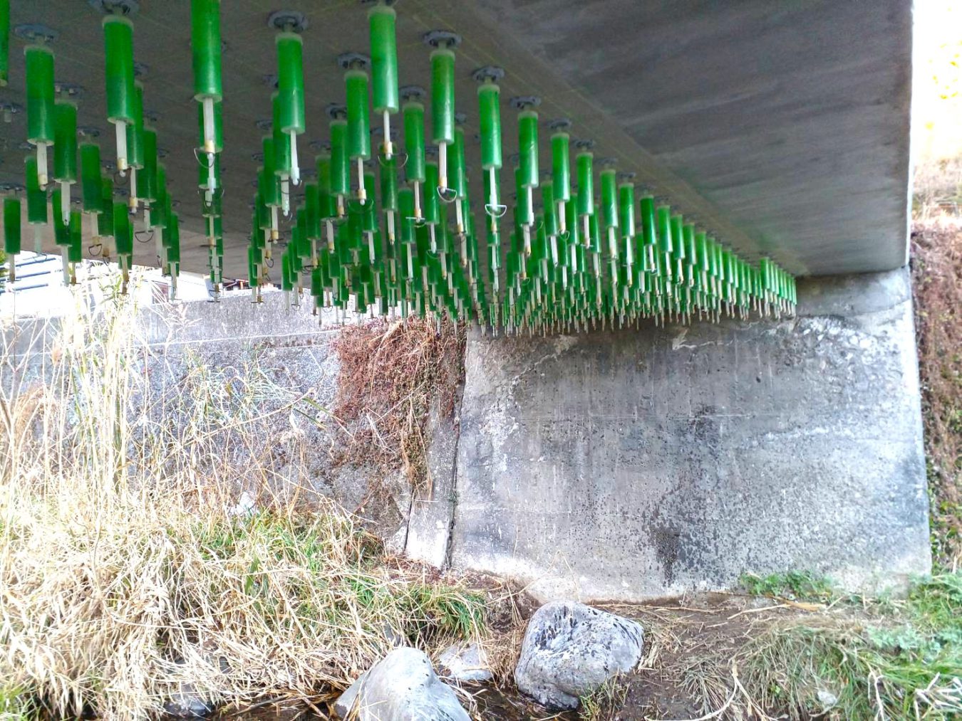 経年劣化や地震などにより傷んだコンクリート構造物の 「強度回復」「長寿命化」を 実現する技術です。穿孔穴の内部から注入された樹脂がコンクリート躯躰内で放射状に拡散することにより、末端の微細クラックまで充填することができます。その画期的な特徴から、鉄筋とコンクリートの付着強度を高めるだけでなく、さらに高い防錆効果が得られる唯一の高密度充填工法として土木学会の技術評価を得ています。
