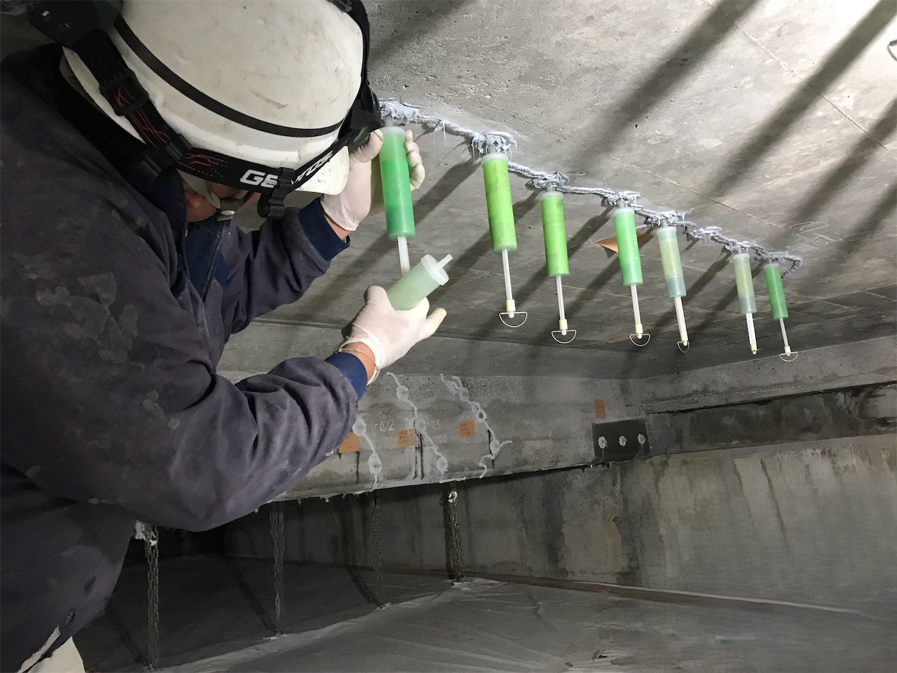 - 空気と樹脂の置換 ひび割れ内部に残る空気が“押し戻し”の原因になり、通常の注入では奥まで入りにくいことがあります。本工法は注入位置に孔をあけ、空気を抜き取る作用を持つ注入器(IPHカプセル)で注入することで、内部の空気を樹脂に置き換え、奥まで充填しやすくします。