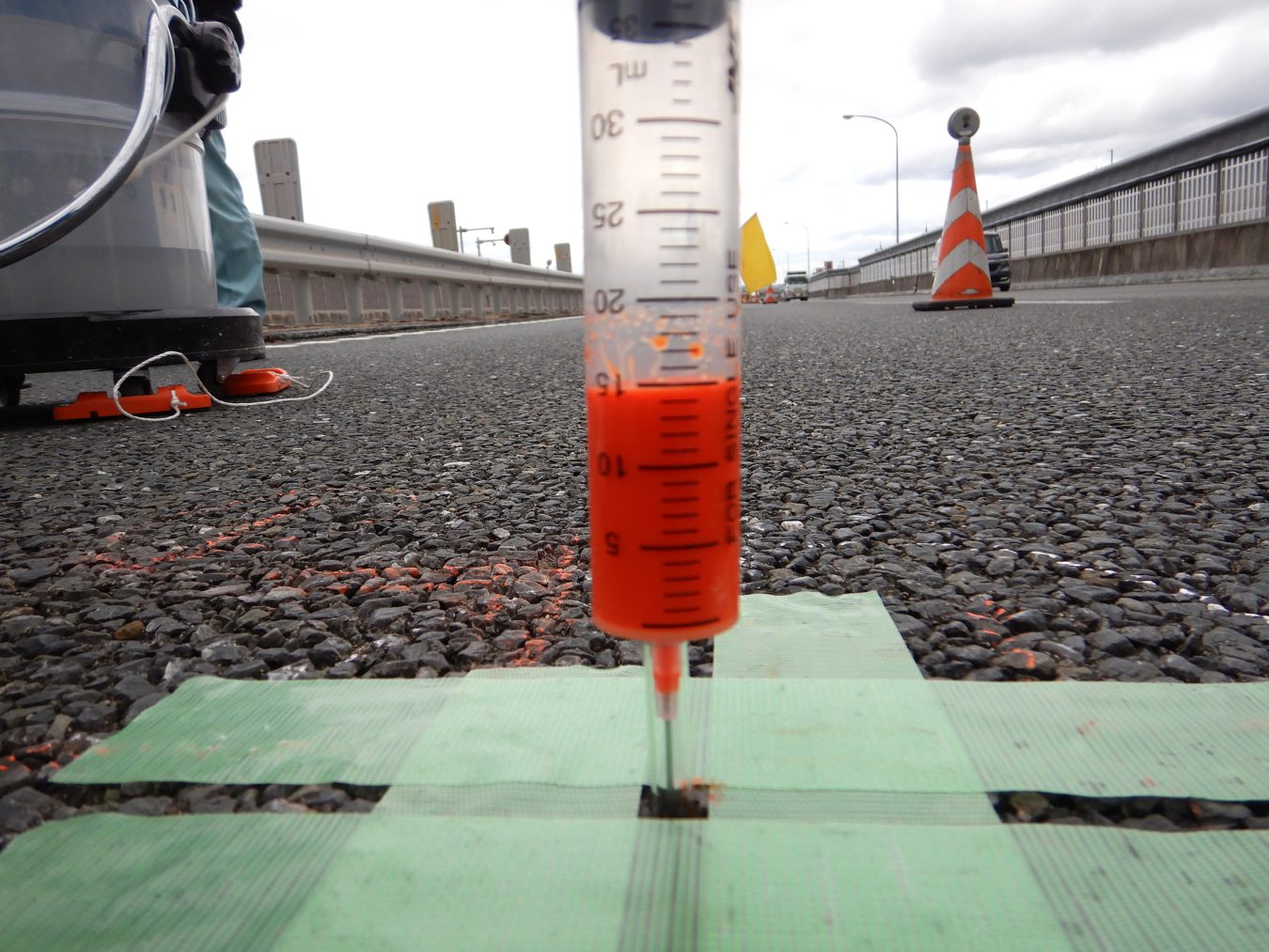 橋梁のコンクリート床版等をひび割れや錆汁の状況等の外観から診断するのではなく、特殊機器を直接コンクリート内部に挿入し、ひび割れの発生状況等、内部の状況を直接確認できるコンクリート内部の微破壊検査法です。