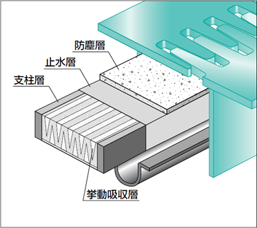 - 止水効果 止水層は上面と側面にウレタンシートを巻き付けた3面止水となっており、構造上止水層のはがれ等は起きないように構成されています。また、引張・引裂強度に優れているため、破断や損傷による漏水の恐れもありません。