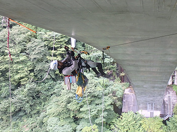 ロープアクセス技術を駆使した橋梁点検手法。主に橋面(高欄、地覆)からロープを設置し、桁・床版下面や橋座、橋台・橋脚の点検を行います。任意の個所への近接が容易です。
